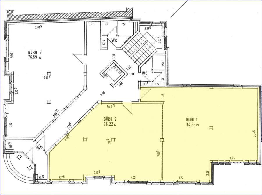 Gesamtfläche: ca. 161 m² (Büro 1 ≈ 85 m² / Büro 2 ≈ 76 m²)