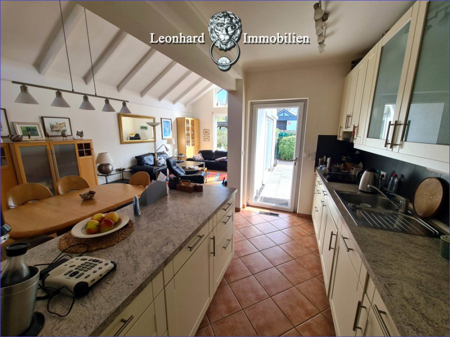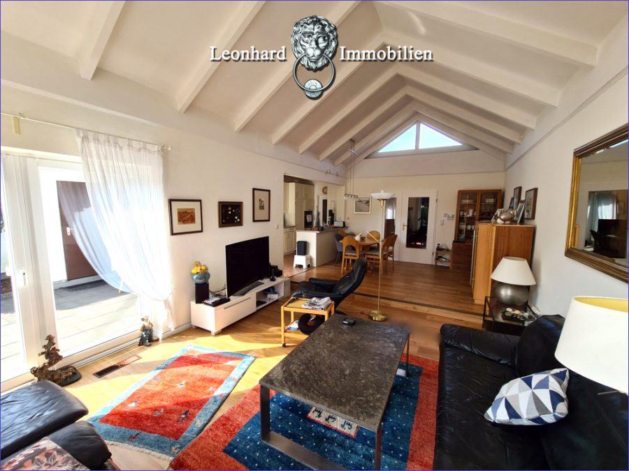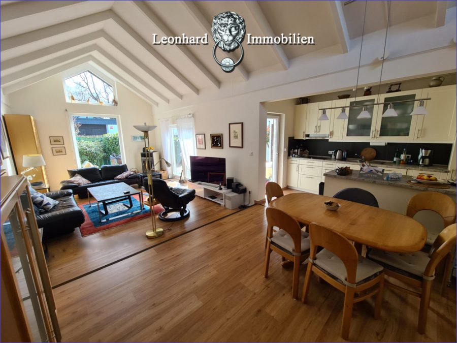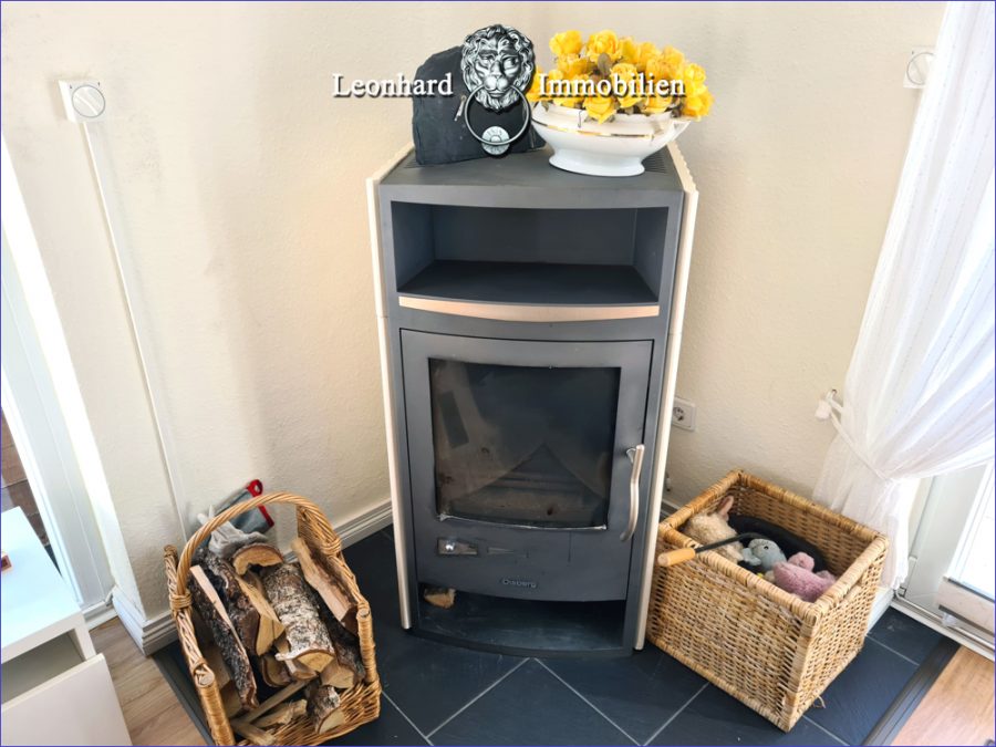 Oder der großzügige Wohn- und Essbereich mit offener Decke, offener Küche und Kaminofen.