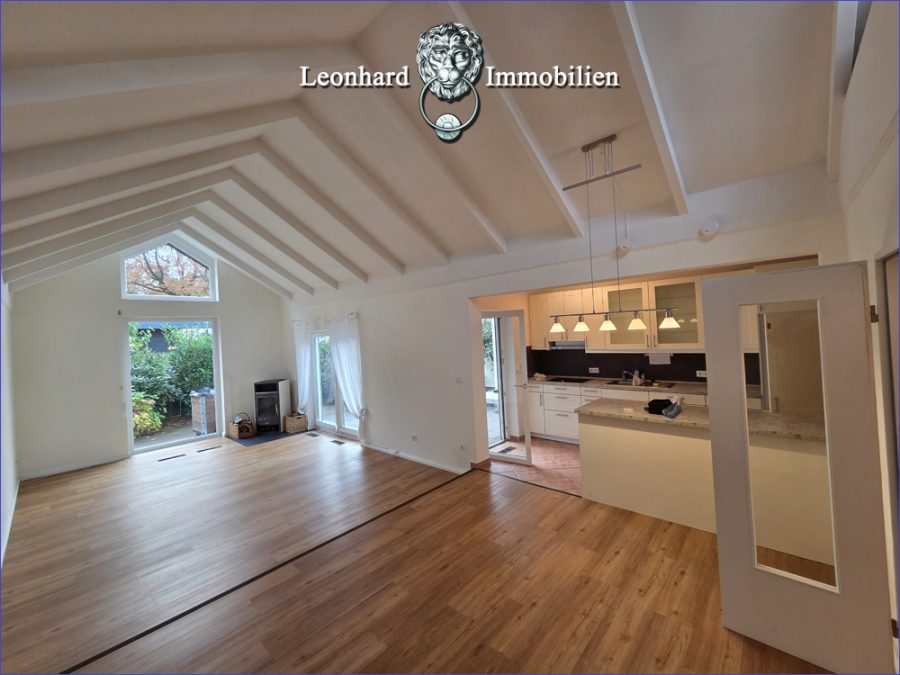 Oder der großzügige Wohn- und Essbereich mit offener Decke, offener Küche und Kaminofen.